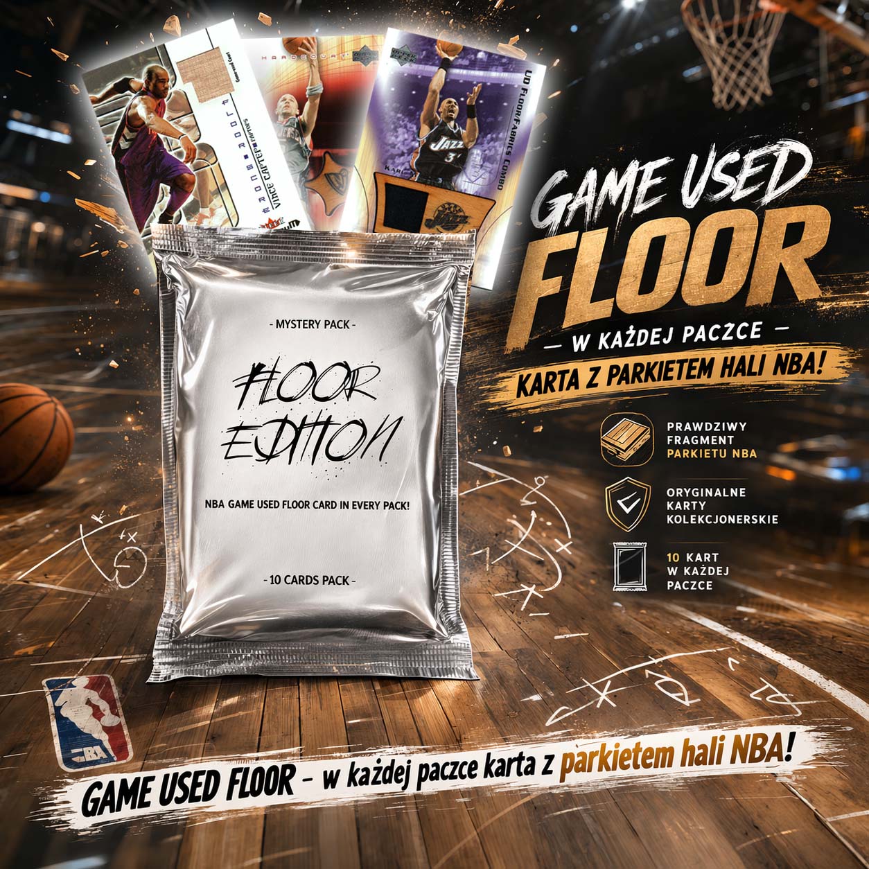 – 1 kartę z autentycznym fragmentem meczowego parkietu z hali NBA (Game Used Floor)