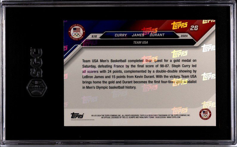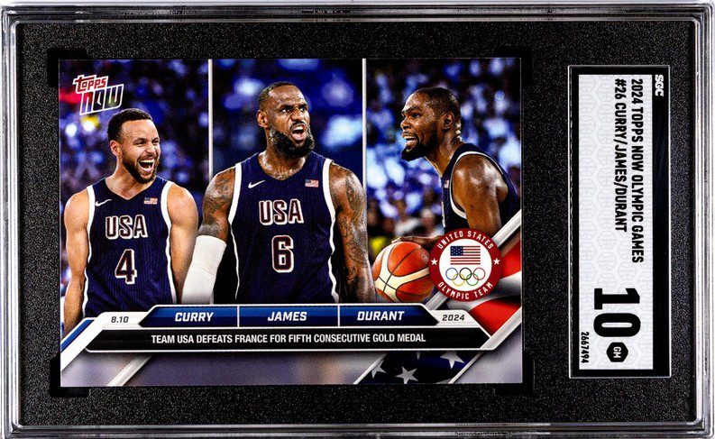 KARTA WYDANA PO IGRZYSKACH OLIMPIJSKICH W 2024 ROKU W RAMACH PROGRAMU TOPPS NOW. KARTĘ MOŻNA BYŁO ZAMÓWIĆ TYLKO W OKREŚLONYM OKRESIE CZASU WYŁĄCZNIE NA STRONIE TOPPS. W PACZKACH MOŻNA BYŁO TRAFIĆ RÓŻNE KARTY UPAMIĘTNIAJĄCE WYSTĘP TEAM USA NA IGRZYSKACH. WIELKIM HITEM TEGO WYDANIA BYŁA KARTA TRIPLE AUTOGRAPH STEPHEN CURRY / LEBRON JAMES / KEVIN DURANT LIMITOWANEJ DO 1/1. NIESTETY DO TEJ PORY NIE ZOSTAŁO POTWIERDZONE JEJ TRAFIENIE. WIĘCEJ O TEJ HISTORII PRZECZYTACIE NA NASZYM BLOGU –> TUTAJ
